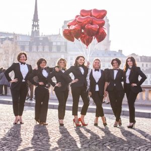 Tacky fancy dress is out, cool dress codes are in. Tropical Disco, 70’s Bohemian, Botanical Brights, Ibiza White, 90’s Kid….the list is endless. Go as subtle or as full on as you dare. Channel Martine McCutcheon on her Parisian hen do – Martine, take a bow for your gloriously simple yet super chic tuxedo & heels combo.